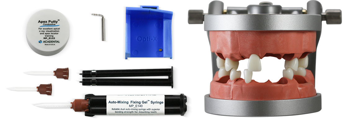 Modular typodont with maxillary and mandibular modules for use with replica or natural teeth. Modules attach magnetically to the Carrier Tray and are compatible with the ModuPRO OS3 system. Improved radiographic clarity and wider sockets for maxillary first molars enhance access and realism. Includes conductive Apex Putty, Fixing Gel, and apex locator bars for use with an electronic apex locator.